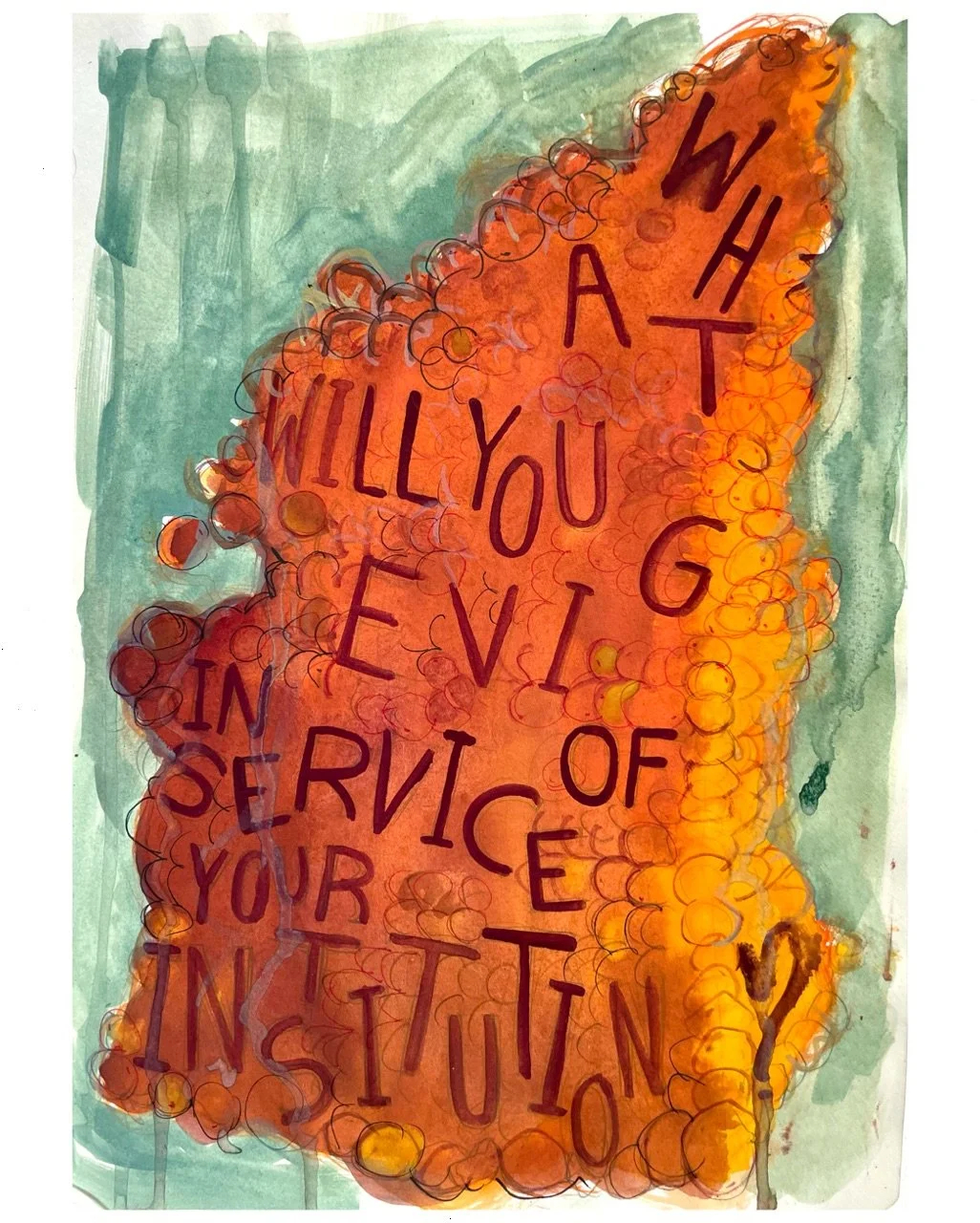 A watercolor illustration of a large, orange, textured cloud with the message: "What will you give in service of your institution?" written in purple and black letters, with a greenish background.