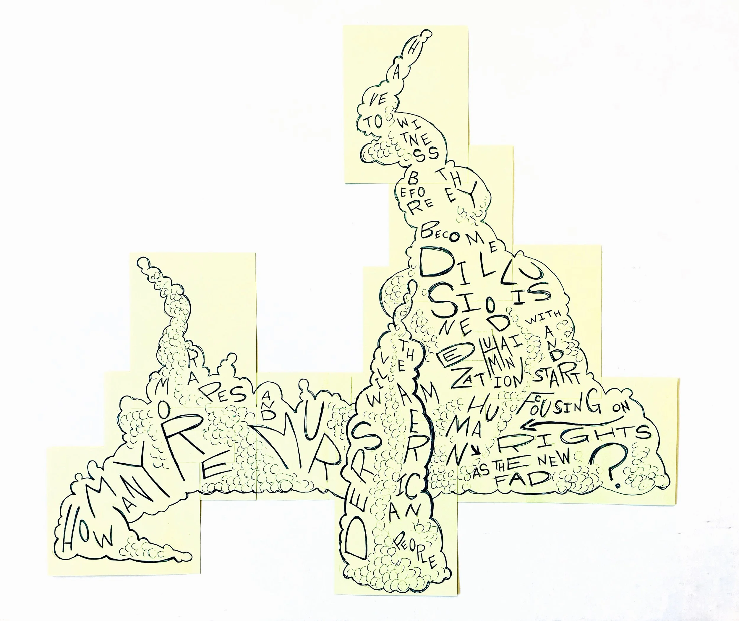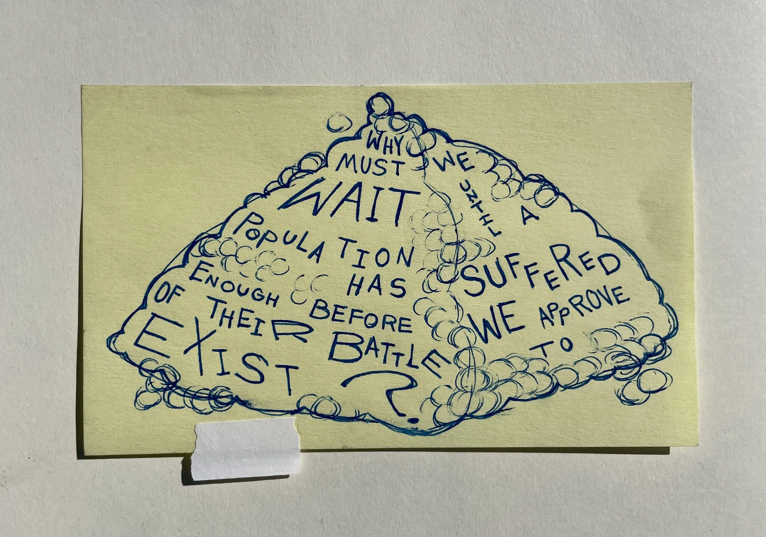 A drawing of a cloud with handwritten words, arranged in the shape of a person with outstretched arms, surrounded by sticky notes, with a message about diversity and fighting for people's rights.