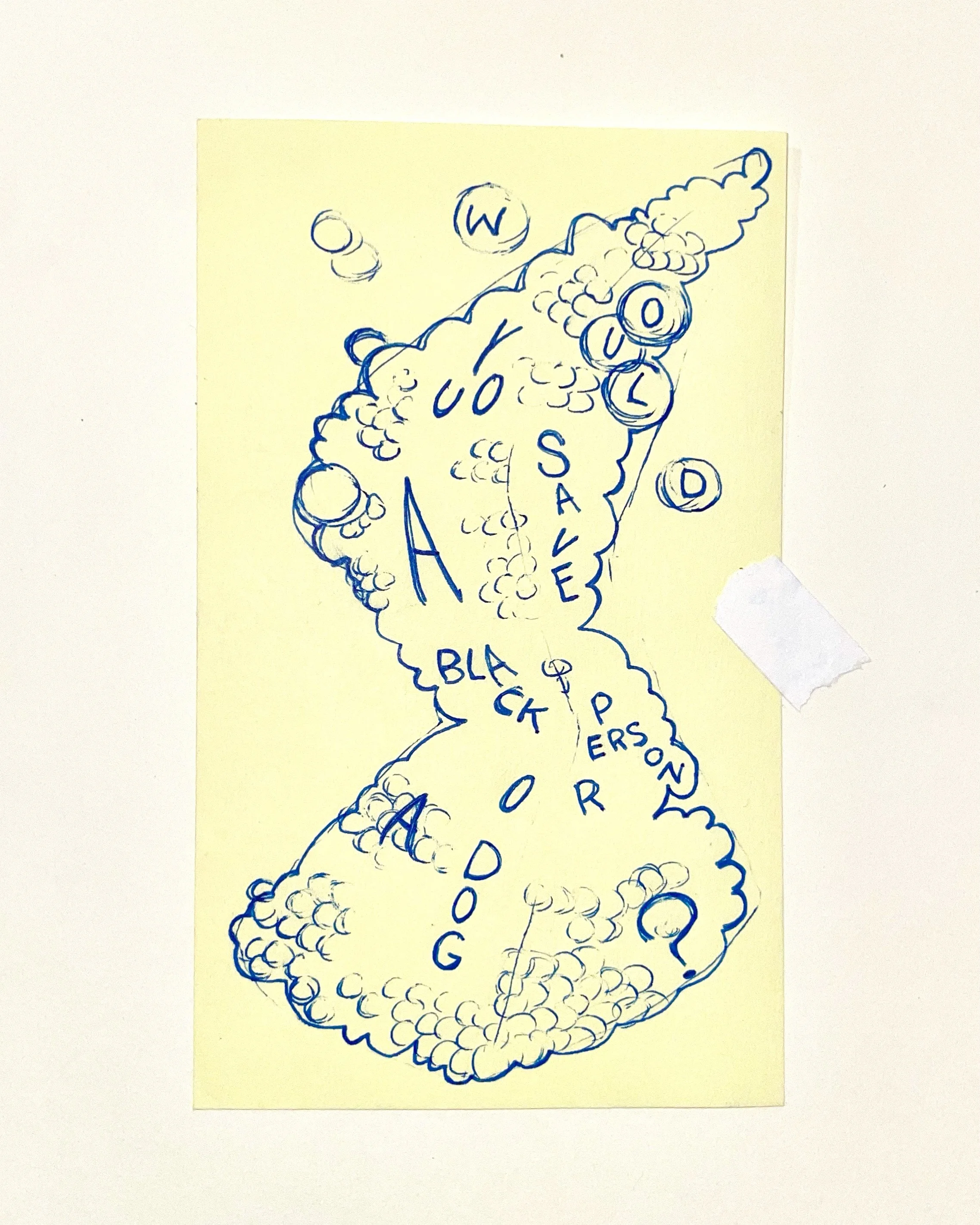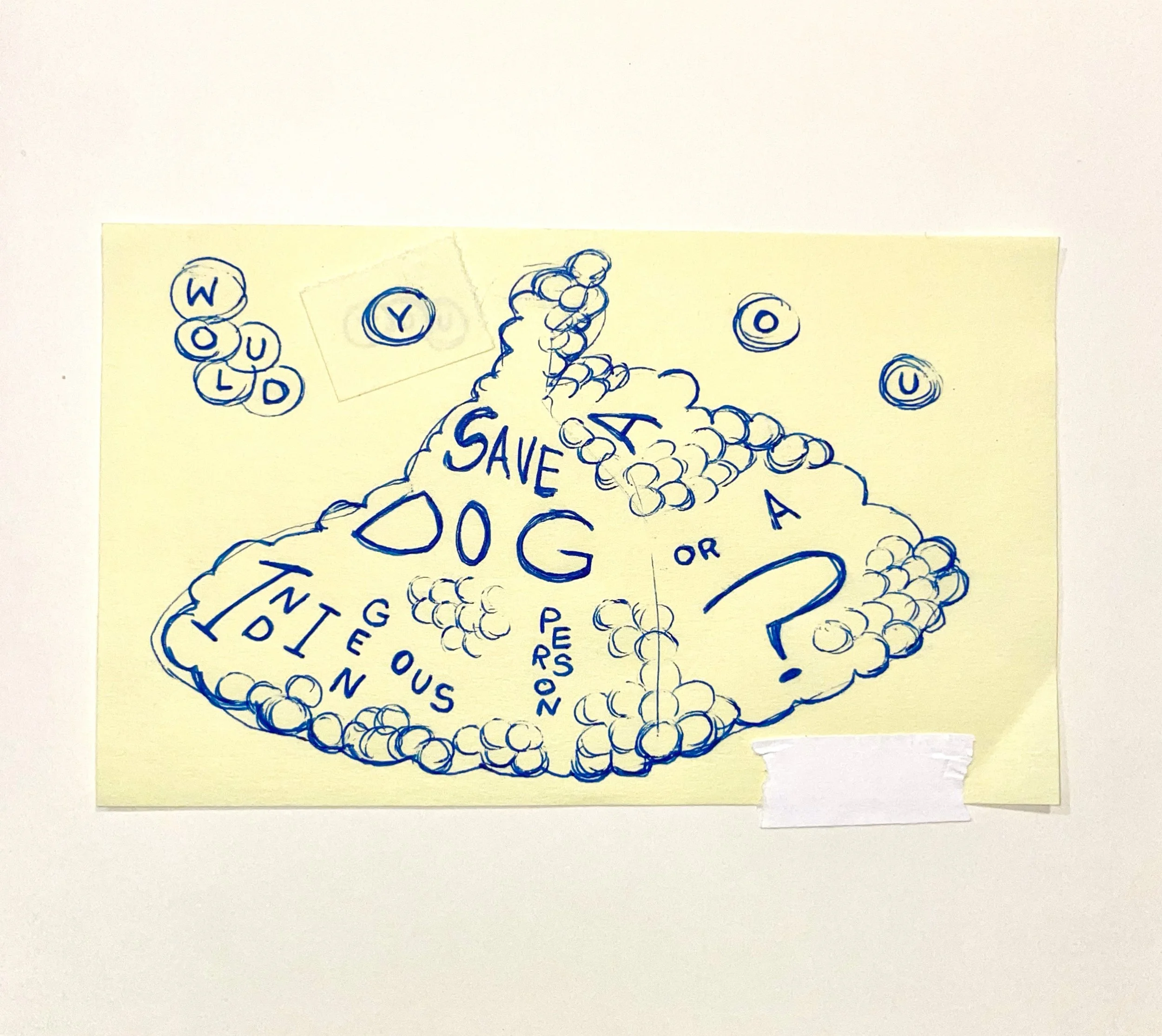 A hand-drawn cartoon on a yellow sticky note with the words 'Save Dog or a Cat!' surrounded by a pile of bubbles and scattered alphabet letters.