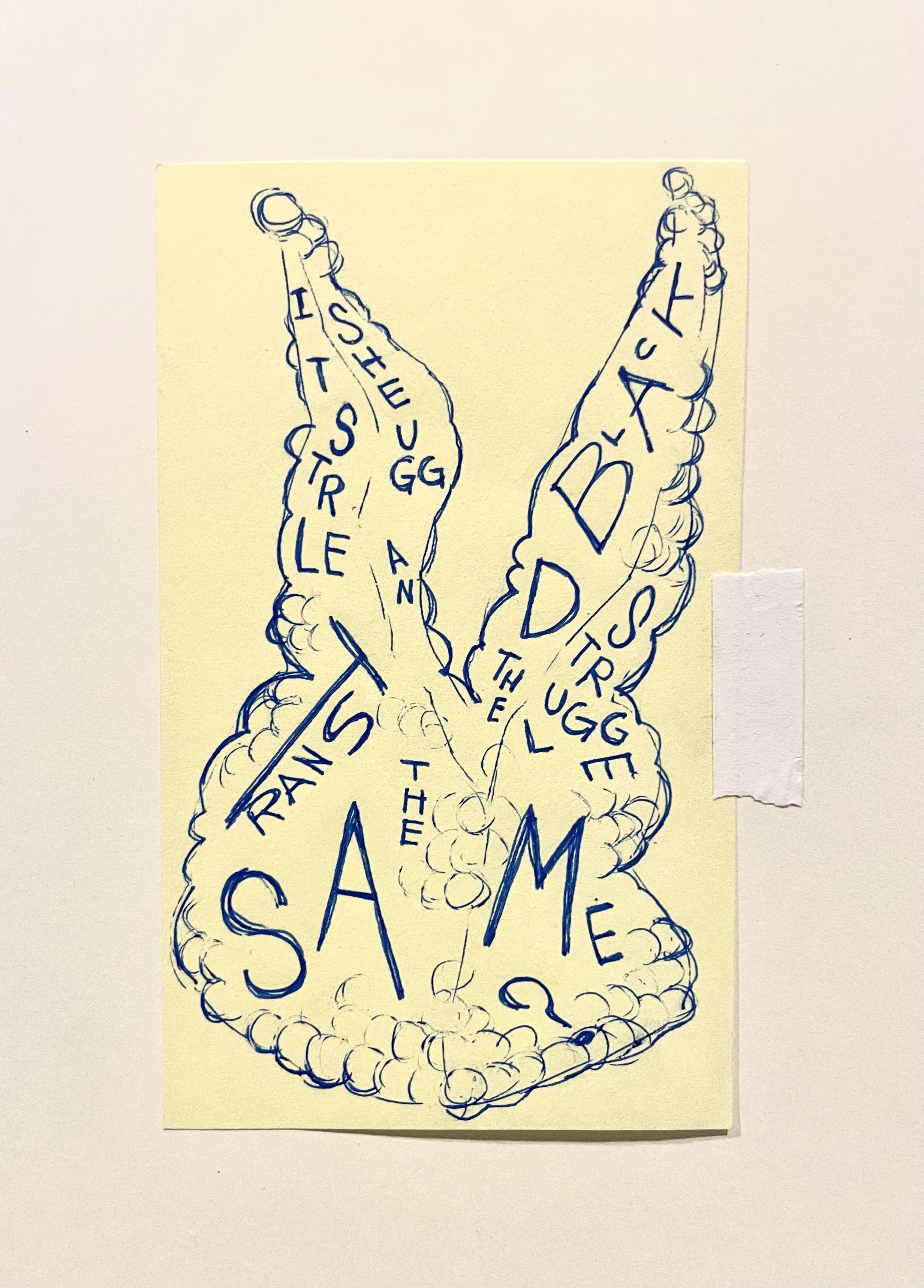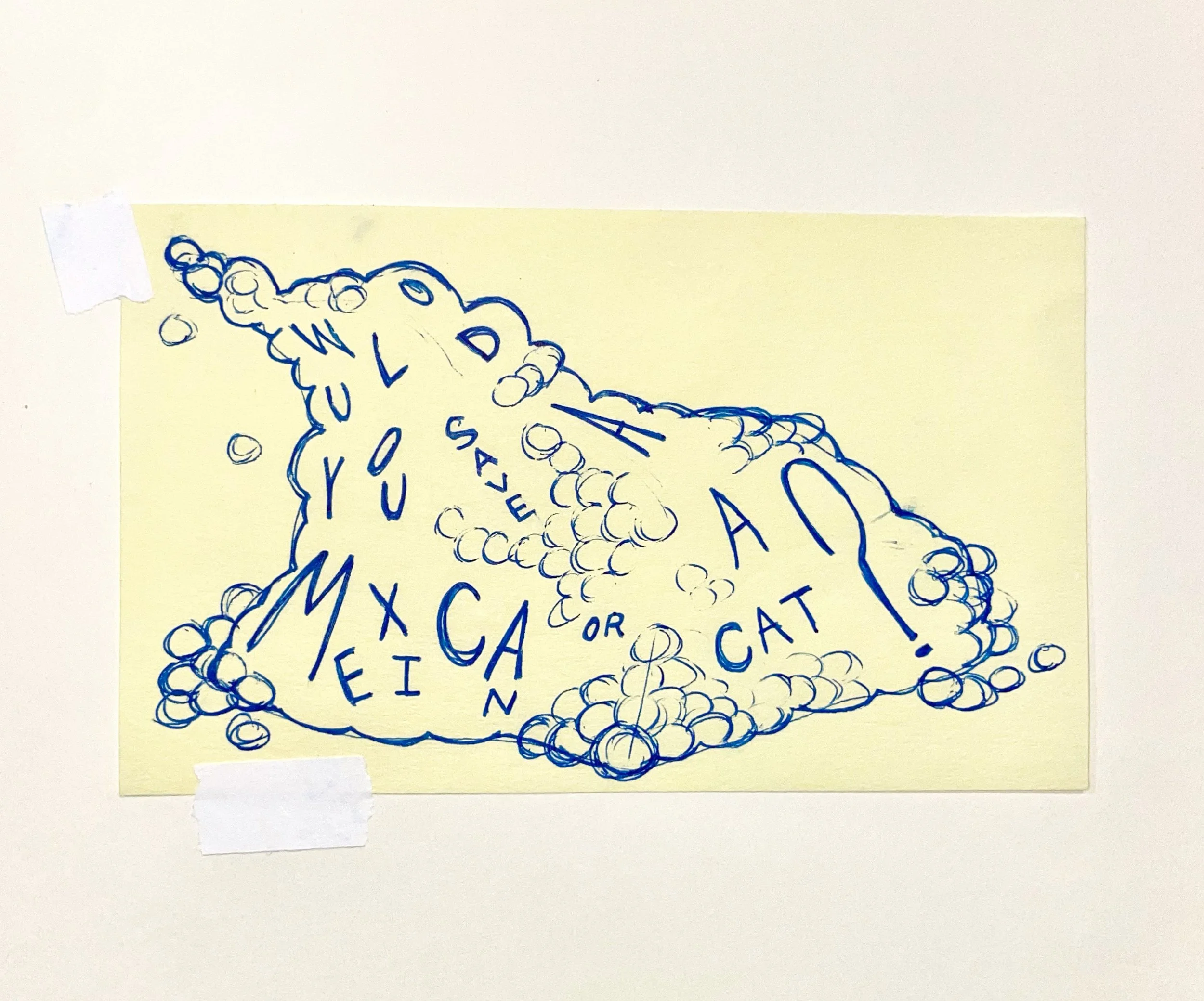 A hand-drawn illustration of a muscular arm flexing, shaped like a cloud, with words written inside the shape that say, "Would you ever ask a person" and other words are partially visible.