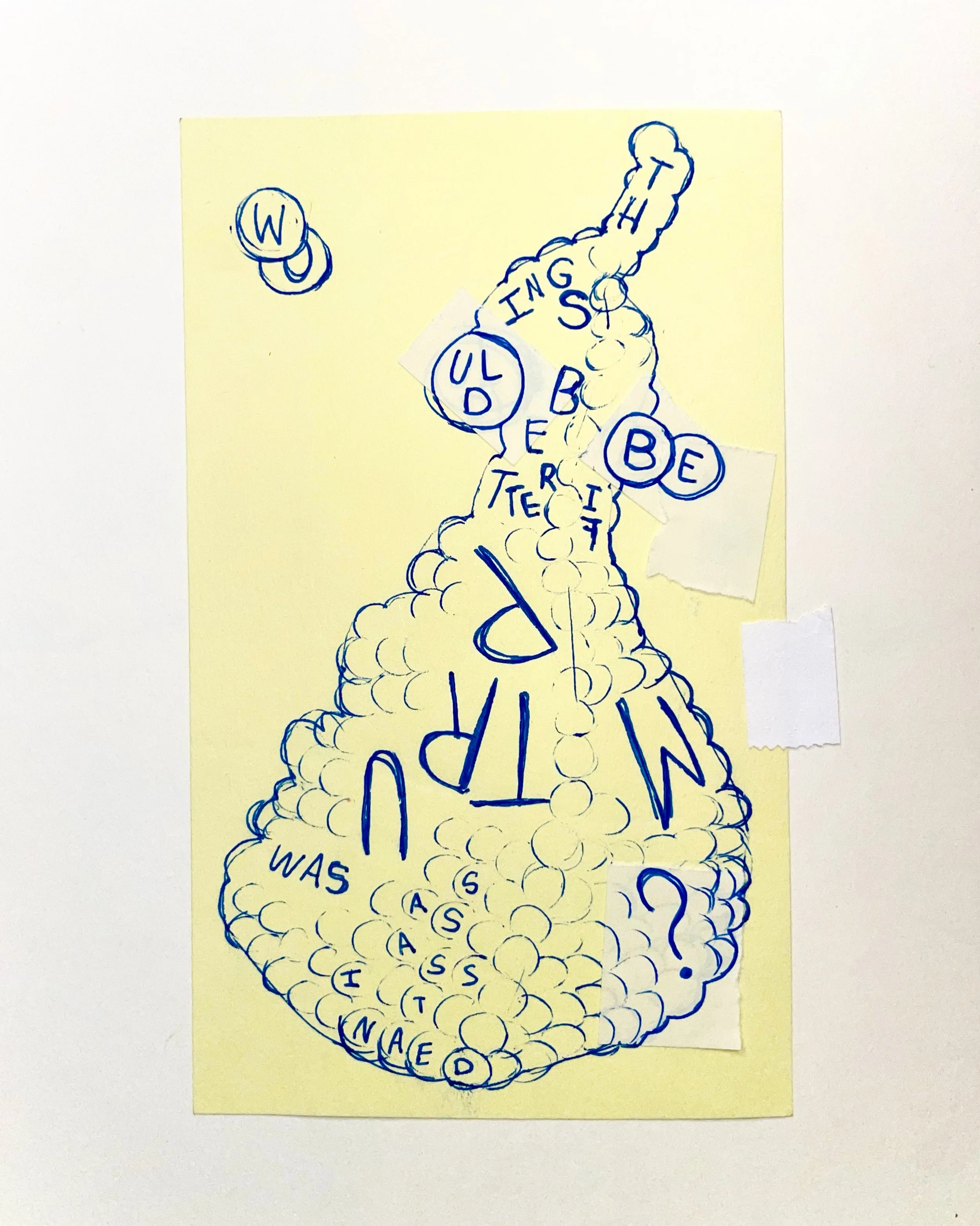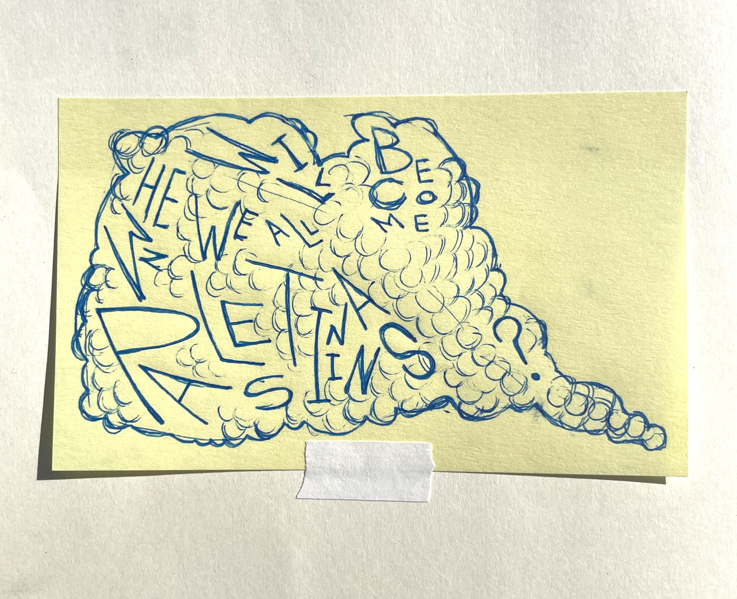 Yellow sticky note with a blue ink drawing of a cloud filled with words like 'W' 'O' 'R' 'D' and 'S,' and smaller clouds with words such as 'BLA,' 'G,' 'K,' 'P,' 'ER,' 'S,' 'O,' 'D,' 'G,' and a question mark.
