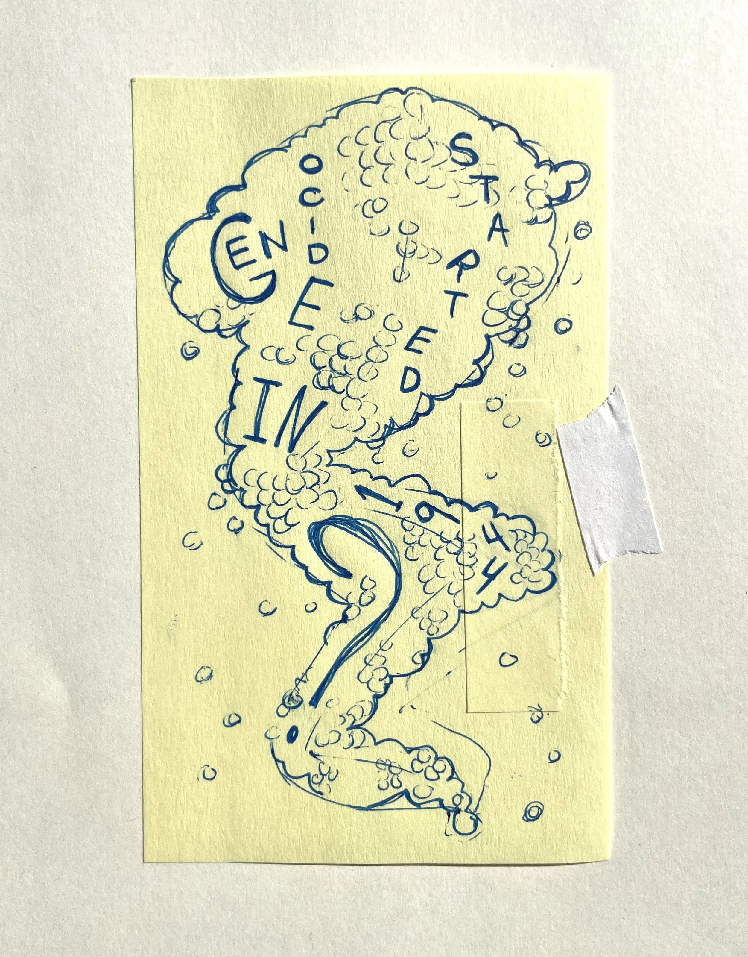 Hand-drawn illustration on a yellow sticky note of a cartoonish pipe emitting clouds of smoke shaped like a tree. Inside the smoke are words and numbers: 'ENCODED GARD STATED IN 1944'.