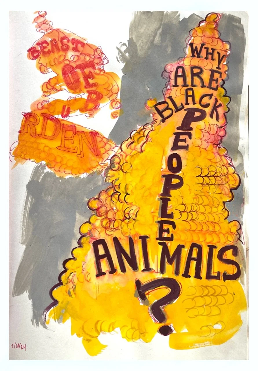 A colorful illustration with abstract shapes and handwritten text asking, "Why are Black animals..." with words in bold black and orange, on a background of yellow, orange, and gray shades.