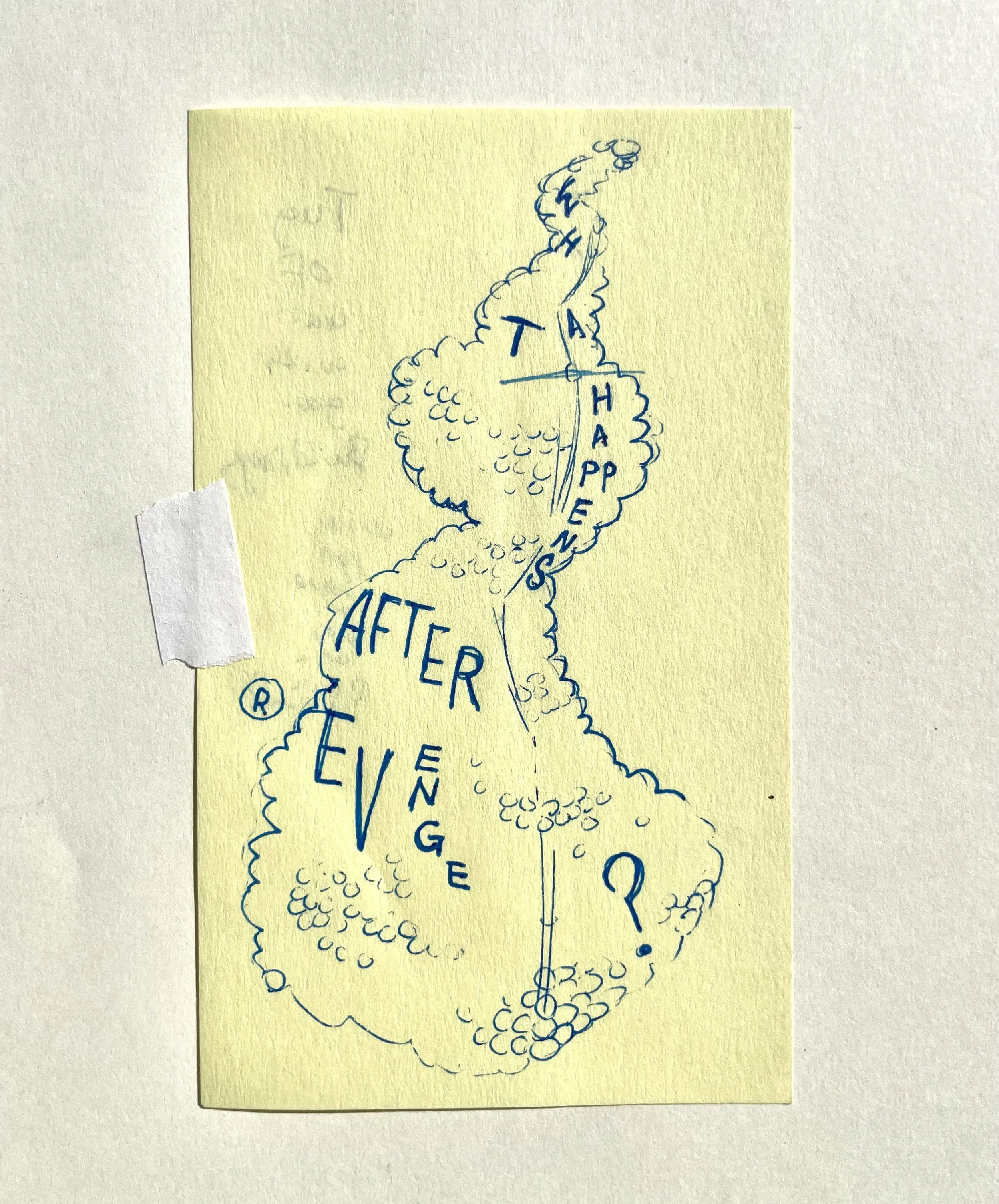 A yellow sticky note with a blue doodle of a cloud of smoke containing the words 'CHEMICAL REACTIONS' and a question mark, with some lightning bolts.