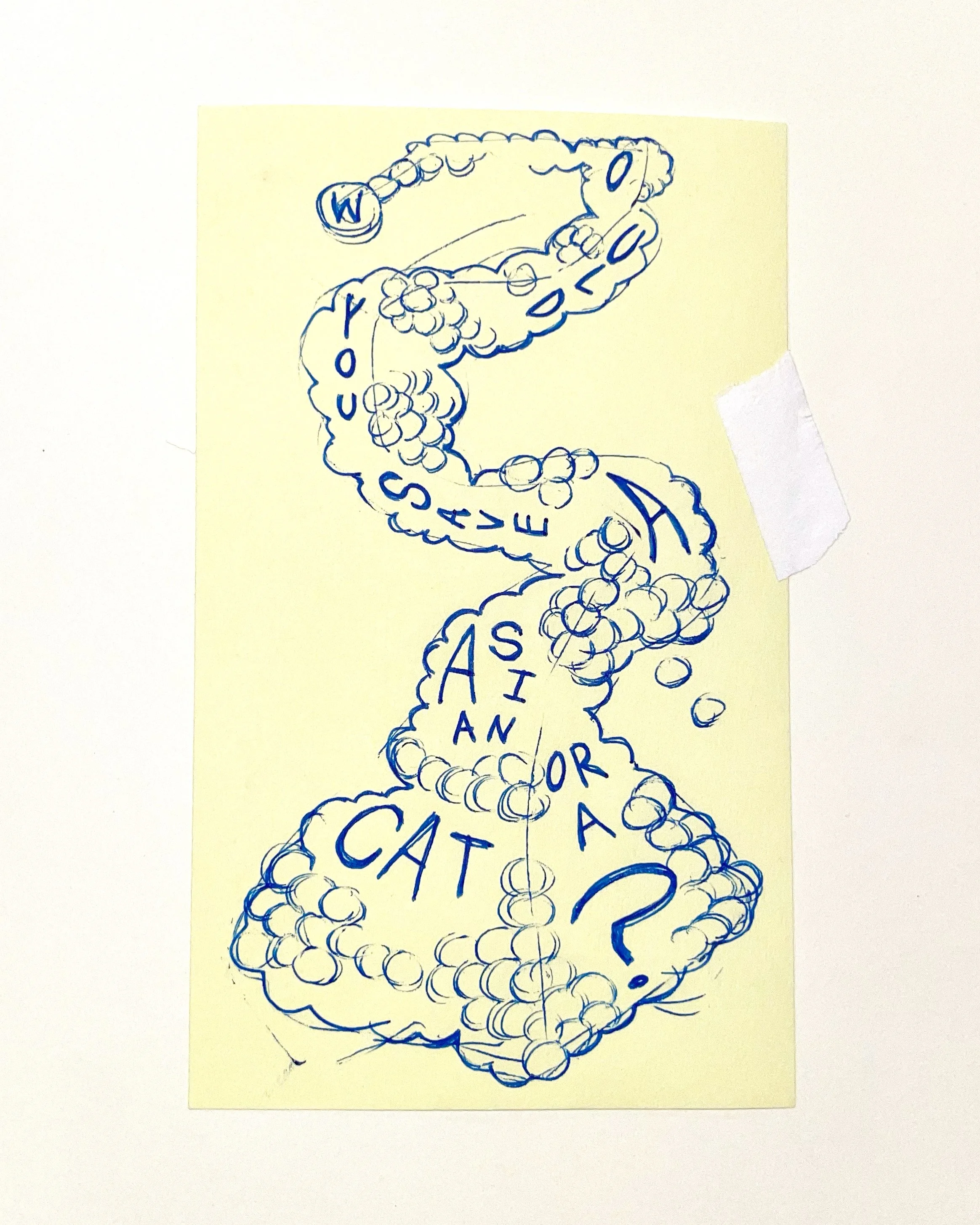 Hand-drawn illustration of a question in the shape of a smoking pipe with bubbles, asking 'Are you such a cat or a?'