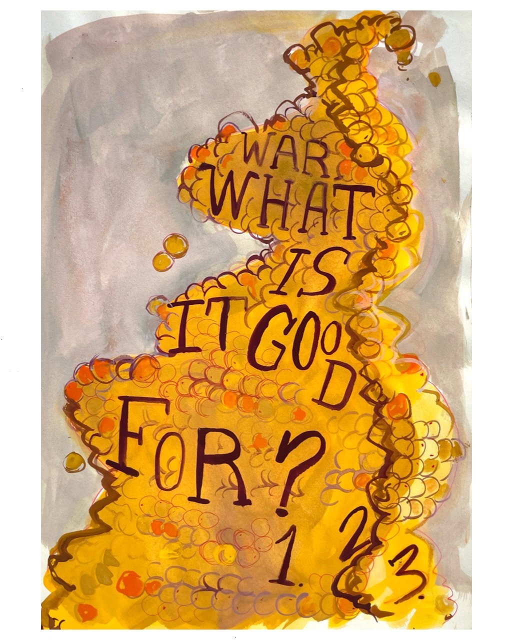 A colorful, abstract watercolor painting featuring a question in purple text: "WART WHAT IS IT GOOD FOR?" with the numbers 1, 2, and 3 listed below.