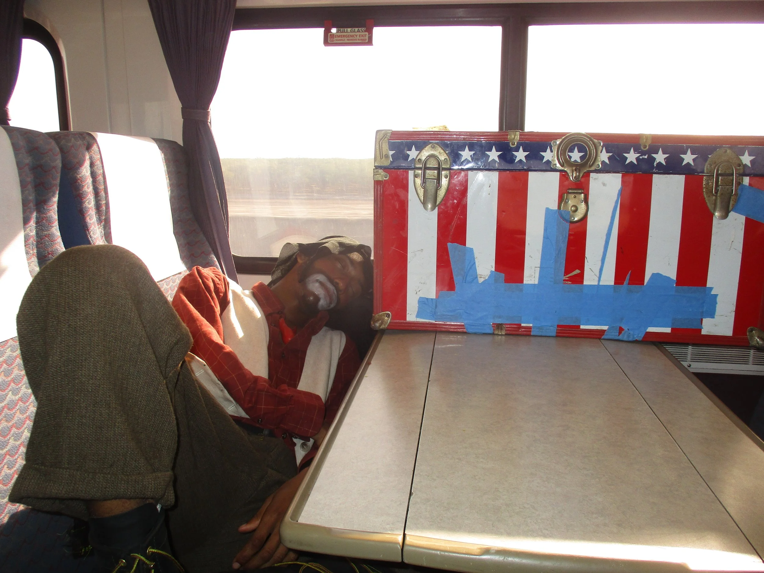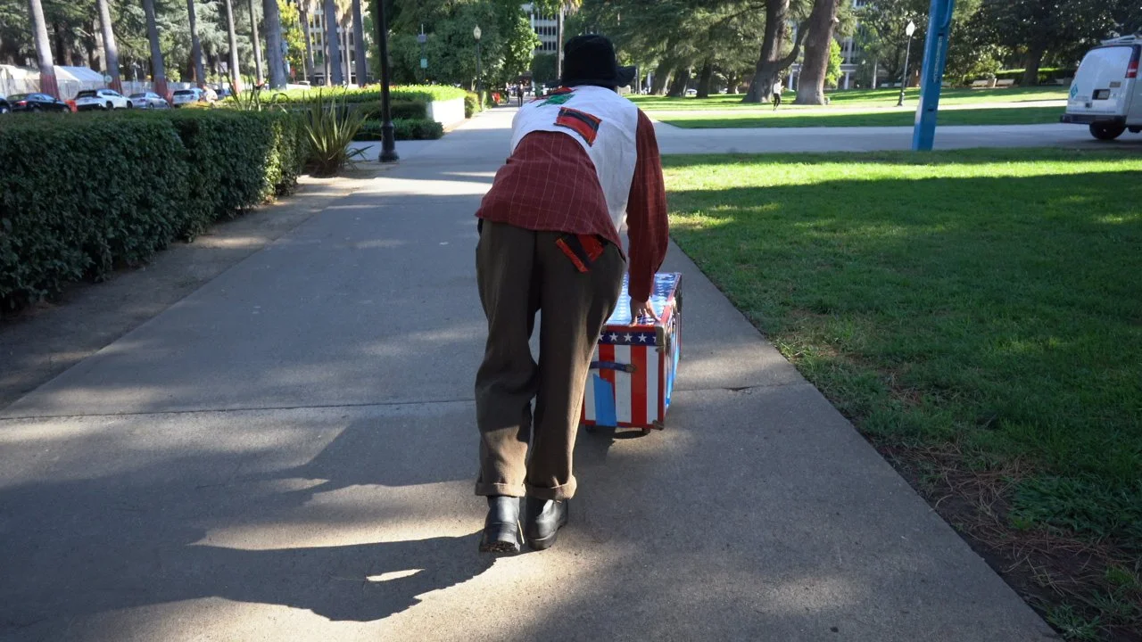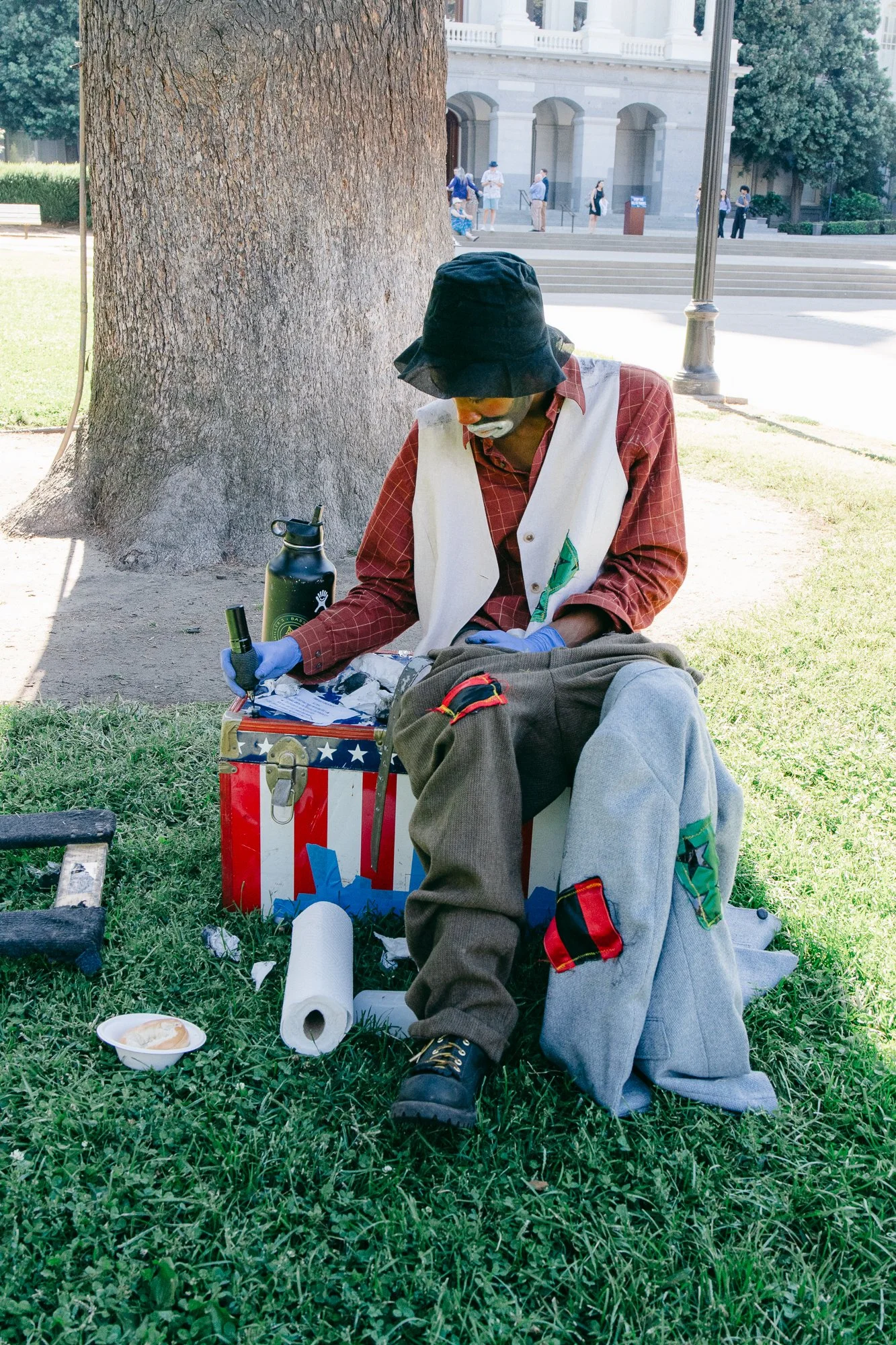 The performance involved Vinson dressed as a tramp clown dragging along a trunk on wheels with an American flag design on it, traveling from Sylmar to the California Capitol Building on foot, by bus, train, and by hitchhiking. When at the capital, Vinson removed tattooing equipment from their trunk and tattooed the court case for Roe V. Wade, section one of the Fourteenth Amendment, and the First Amendment title on their leg. After tattooing themselves, Vinson traveled back to Sylmar on foot, by bus, by train, and by hitchhiking.