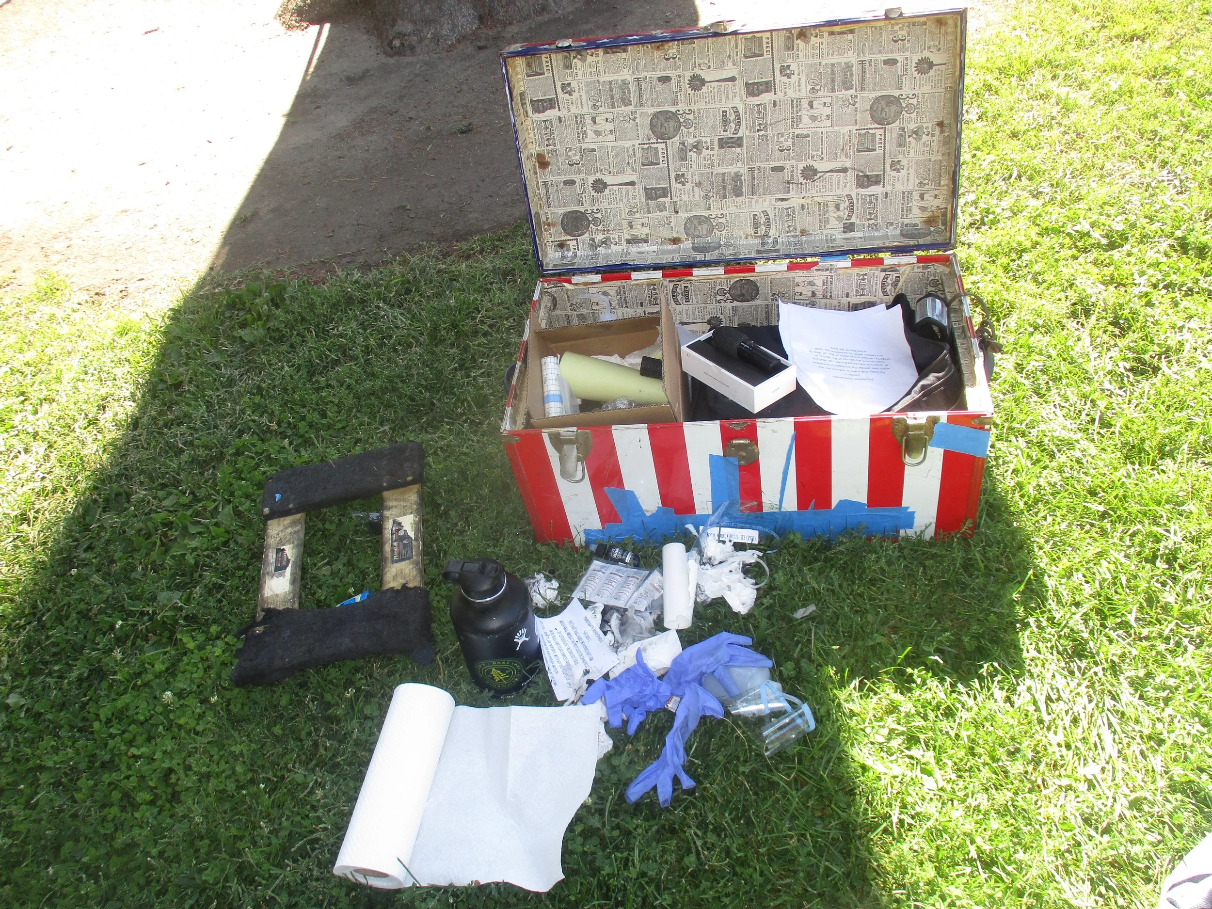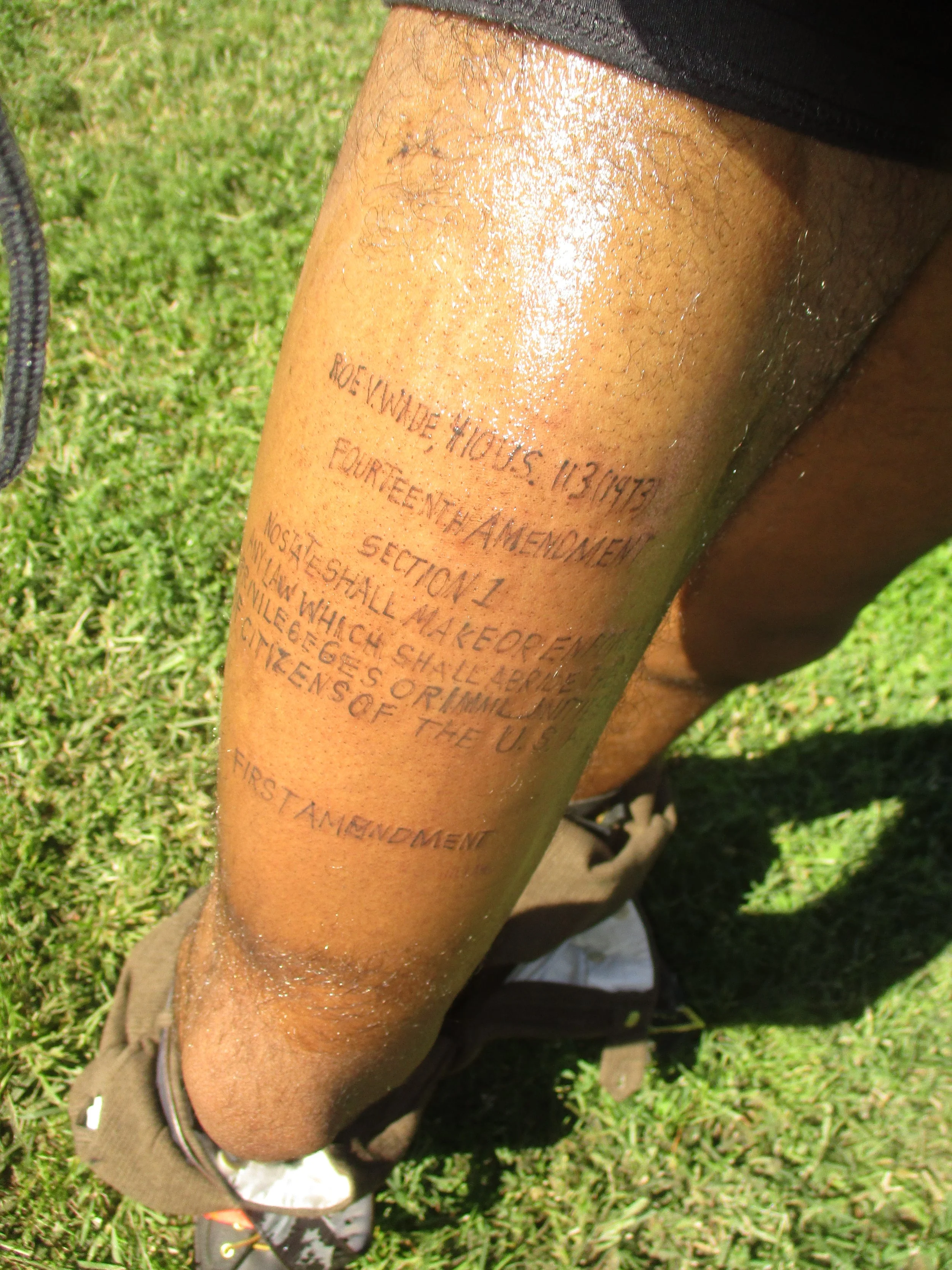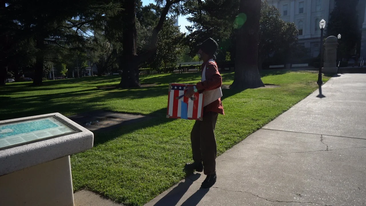 The performance involved Vinson dressed as a tramp clown dragging along a trunk on wheels with an American flag design on it, traveling from Sylmar to the California Capitol Building on foot, by bus, train, and by hitchhiking. When at the capital, Vinson removed tattooing equipment from their trunk and tattooed the court case for Roe V. Wade, section one of the Fourteenth Amendment, and the First Amendment title on their leg. After tattooing themselves, Vinson traveled back to Sylmar on foot, by bus, by train, and by hitchhiking.