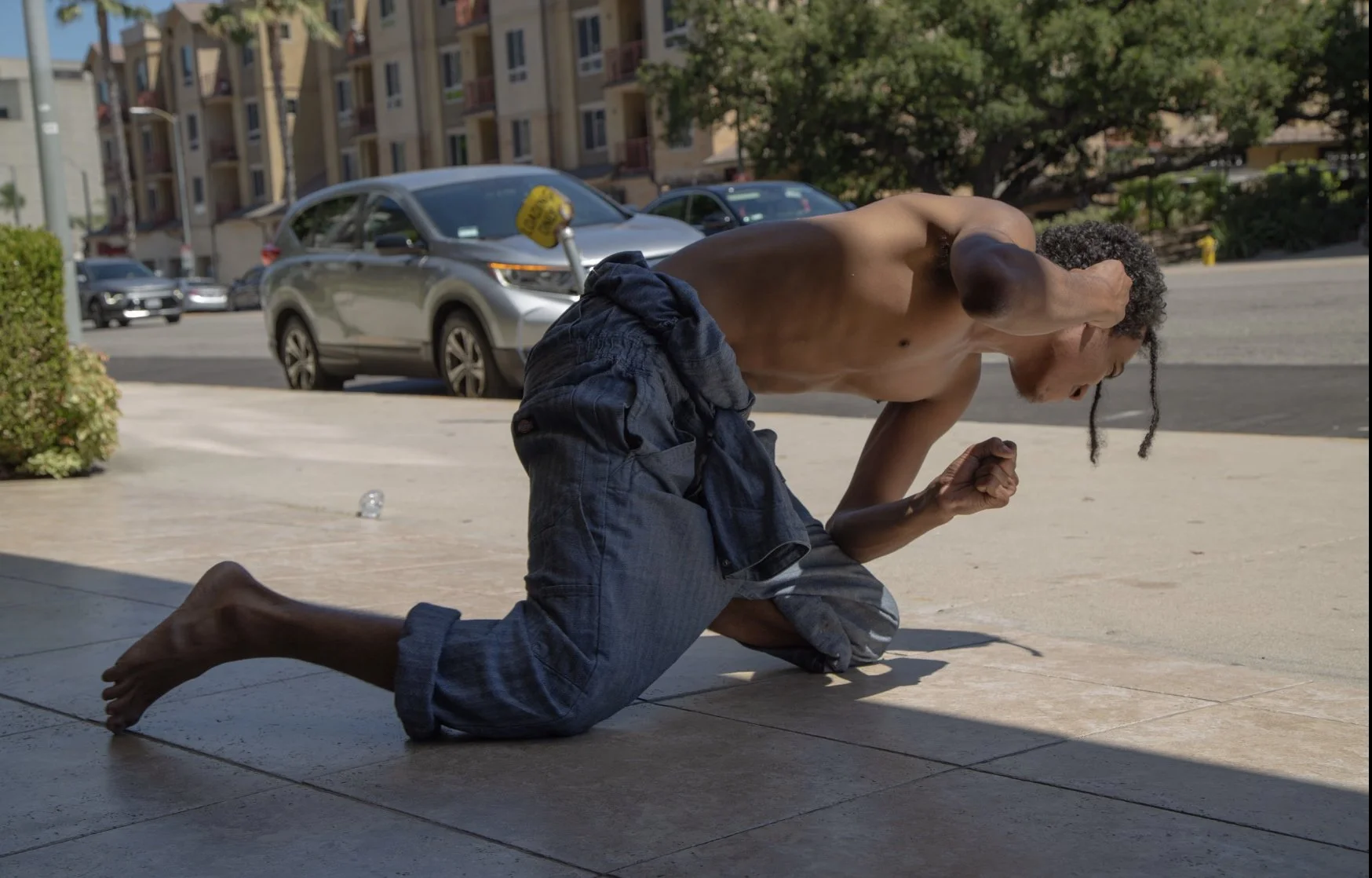 Vinson engages in a silent struggle against pillars of power. Barefoot and shirtless, wearing only jeans, Vinson mimes an intense tug of war with “invisible” opponents.