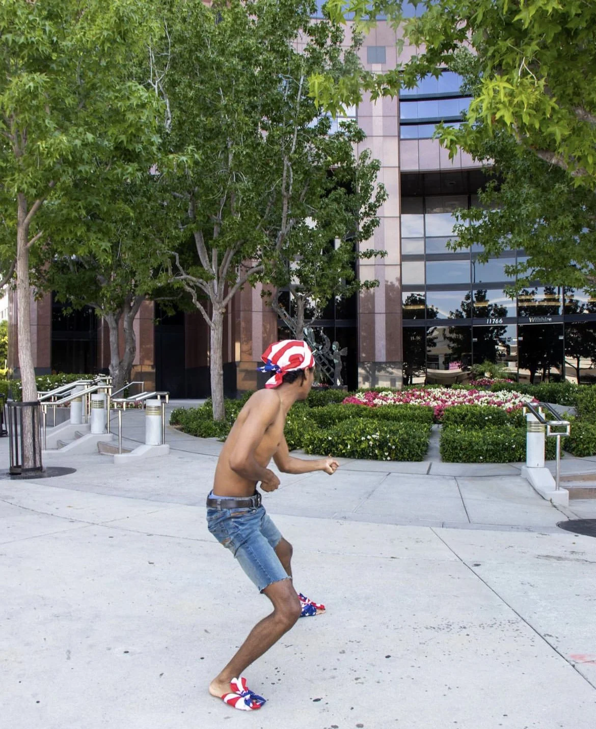 In a variation on Pull Tug Pull #1, Vinson dons American flag bandanas on their head and feet.